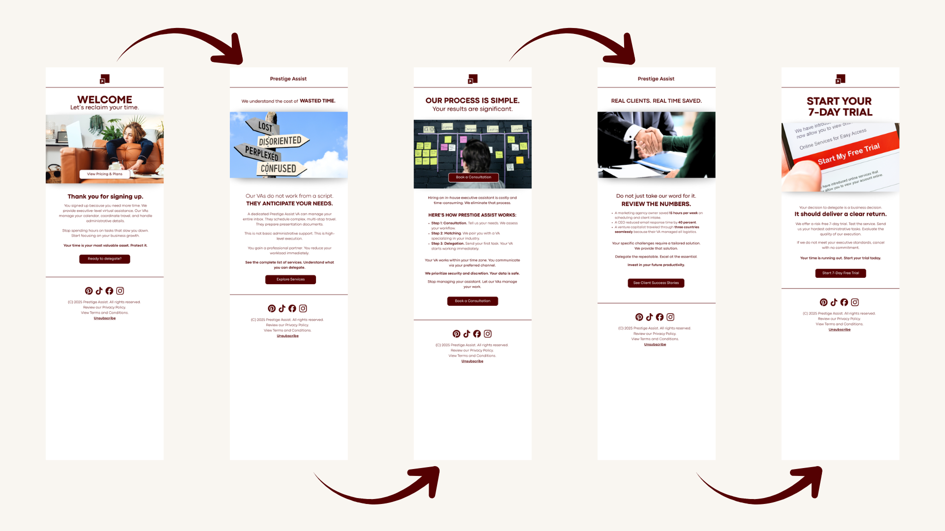 • The flow introduces the brand’s process, showcases real results, and ends with a clear call to action that moves the subscriber closer to becoming a client.