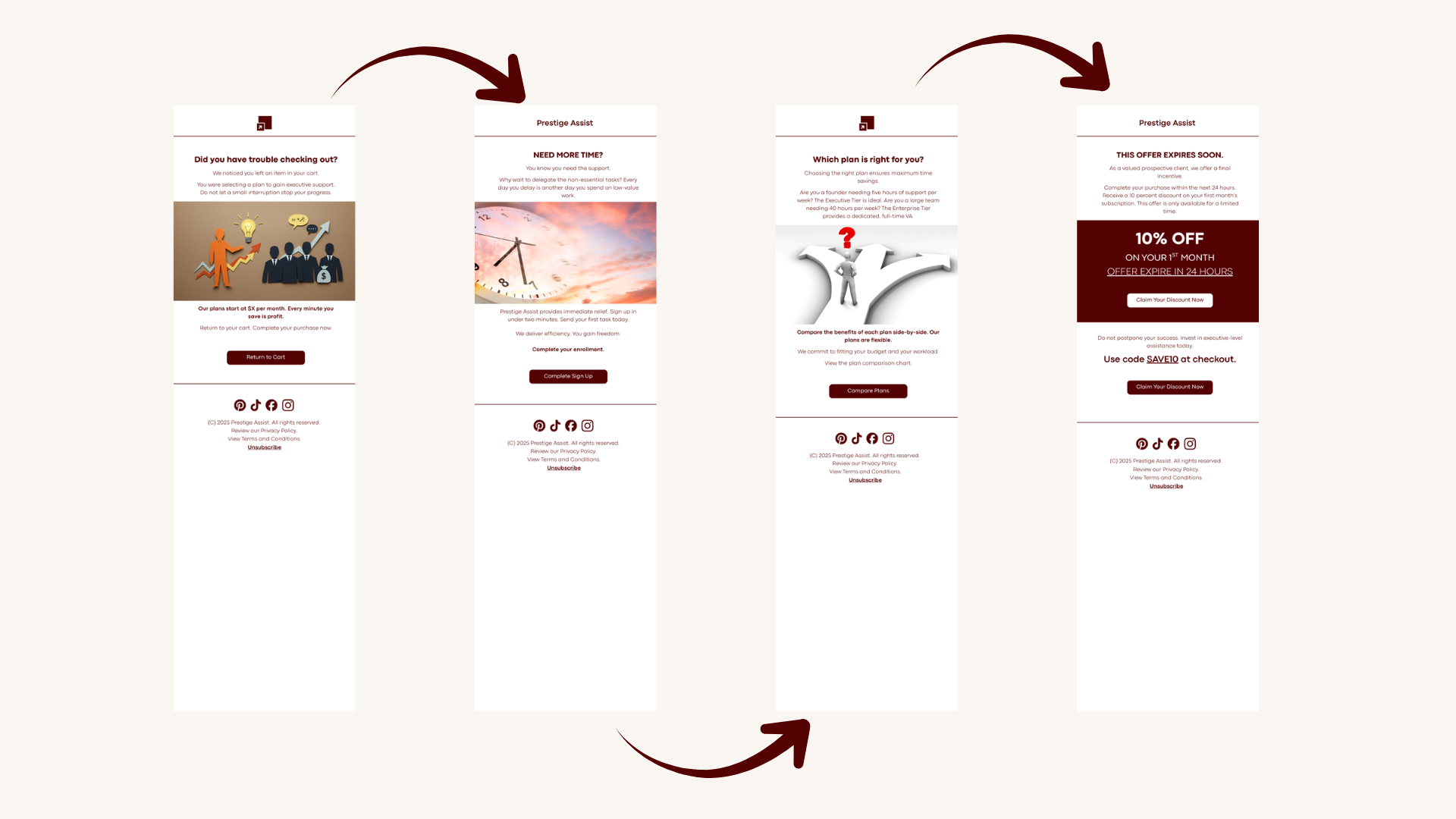 • The sequence feels helpful instead of pushy, keeps the tone warm, and makes it easy for subscribers to return to their cart.